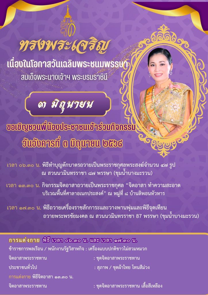 เทศบาลตำบลศรีสุนทร ขอเชิญชวนประชาชนทุกหมู่เหล่า ร่วมกิจกรรมเฉลิมพระเกียรติ เนื่องในโอกาส วันเฉลิมพระชนมพรรษา สมเด็จพระนางเจ้าฯ พระบรมราชินีในวันที่ 3 มิถุนายน 2568