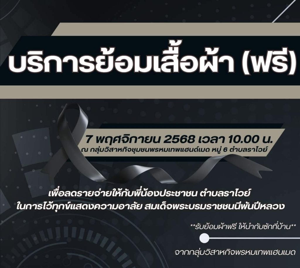 ณ กลุ่มวิสาหกิจชุมชนพรหมเทพแฮนด์เมด หมู่ 6 ตำบลราไวย์ กลุ่มวิสาหกิจชุมชนพรหมเทพแฮนด์เมด บริการย้อมเสื้อผ้า (ฟรี)ให้กับพี่น้องประชาชน ที่ต้องการเปลี่ยนสีเสื้อผ้า (จากสีต่างๆ) ให้เป็นสีดำ เพื่อลดรายจ่ายให้กับพี่น้องประชาชน ตำบลราไวย์ ในการไว้ทุกข์แสดงความอาลัย สมเด็จพระบรมราชชนนีพันปีหลวง