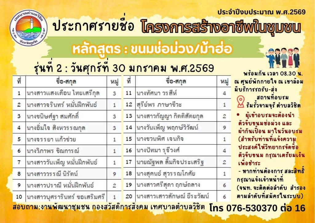 กองสวัสดิการสังคม เทศบาลตำบลวิชิต ประกาศรายชื่อผู้ร่วมโครงการสร้างอาชีพในชุมชน ประจำปีงบประมาณ พ.ศ. 2569 หลักสูตร “ขนมช่อม่วง/ม้าฮ่อ“