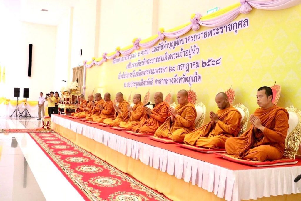 วันที่ 28 กรกฎาคม 2568 เวลา 07.00 น. ณ ห้องประชุมมหิศรภักดี ศาลากลางจังหวัดภูเก็ต จังหวัดภูเก็ตได้จัดพิธีศาสนามหามงคล พิธีเจริญพระพุทธมนต์ และทำบุญตักบาตรถวายเป็นพระราชกุศล เนื่องในโอกาสวันเฉลิมพระชนมพรรษาพระบาทสมเด็จพระเจ้าอยู่หัว โดยมี พระศรีวชิรคุณ เจ้าคณะอำเภอกะทู้ เจ้าอาวาสวัดสิริสีลสุภาราม เป็นประธานฝ่ายสงฆ์ และ นายโสภณ สุวรรณรัตน์ ผู้ว่าราชการจังหวัดภูเก็ต เป็นประธานฝ่ายฆราวาส