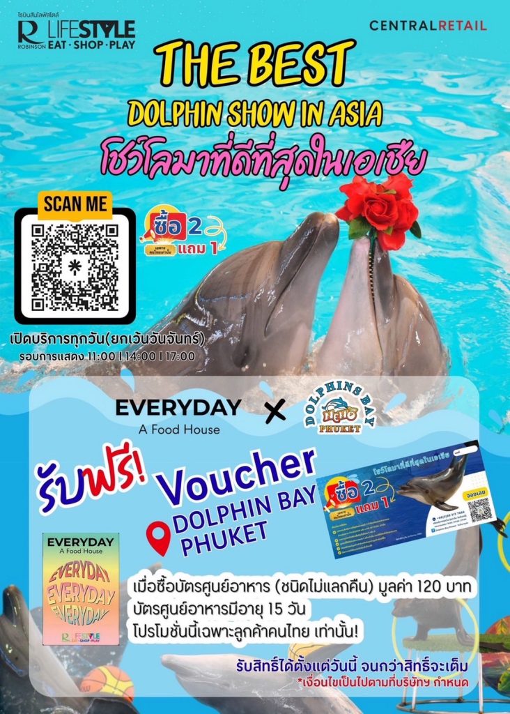 Home » ข่าวทั่วไป » 𝐃𝐨𝐥𝐩𝐡𝐢𝐧 𝐁𝐚𝐲 𝐏𝐡𝐮𝐤𝐞𝐭 ร่วมกับ 𝐑𝐨𝐛𝐢𝐧𝐬𝐨𝐧 𝐋𝐢𝐟𝐞𝐬𝐭𝐲𝐥𝐞 𝐂𝐡𝐚𝐥𝐨𝐧𝐠 จัดแพ็คเกจสุดคุ้มสำหรับลูกค้าโรบินสันไลฟ์สไตล์ ฉลอง เพียง ซื้อบัตรศูนย์อาหารมูลค่า 120 บาท รับคูปองชมโชว์โลมา ซื้อ 2 แถม 1 ทันที