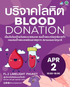 ไลม์ไลท์ ภูเก็ตร่วมกับธนาคารเลือด รพ.วชิระภูเก็ต เชิญบริจาคโลหิตถวายเป็นพระราชกุศล เนื่องในวันคล้ายวันพระราชสมภพสมเด็จพระเทพฯ